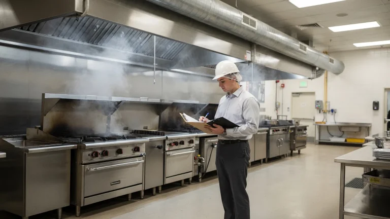 Audit tecnico in una cucina professionale con cappe aspiranti e documentazione impiantistica